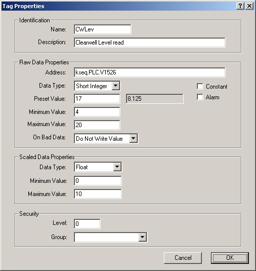 Tag properties include the OPC register assignment, data type, scaling, and system